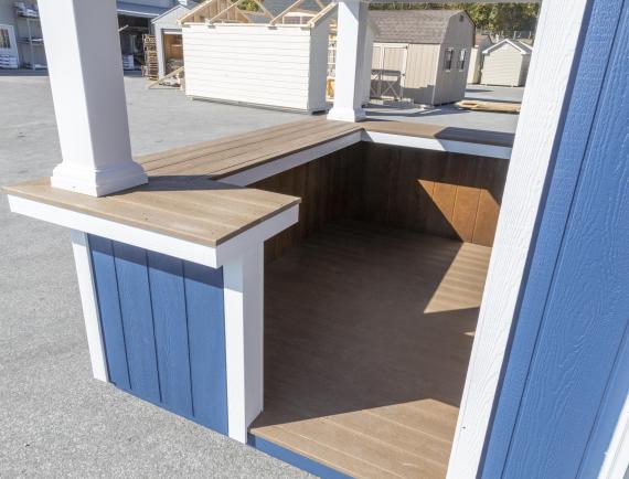 Our A-Frame Cabana gives the same great combination of functionality and recreation, but with the sleek look of the A-Frame roof design. Perfect for a back yard or beside a pool, the A-Frame Cabana has an interior storage area and an exterior bar area that includes a floor and a bar top made of sturdy Evergrain decking material. The cathedral ceiling in the bar area creates an open feel that’s great for entertaining.